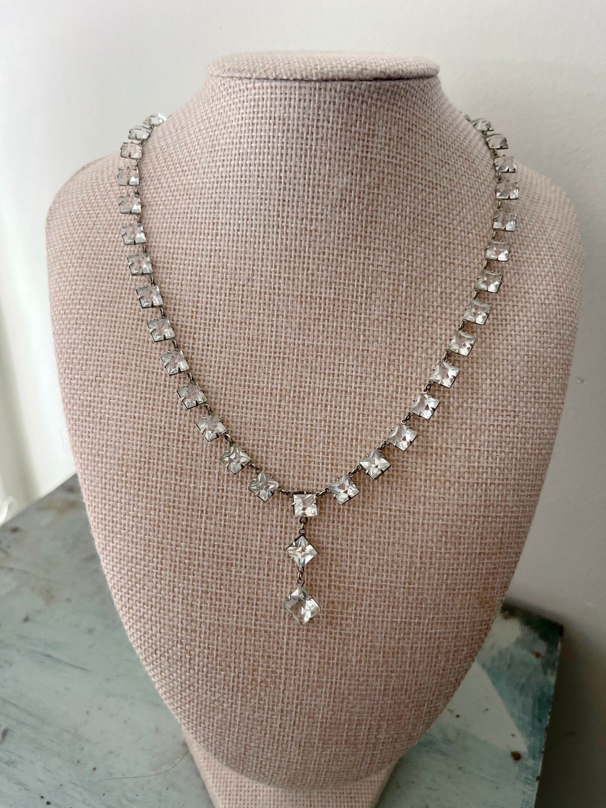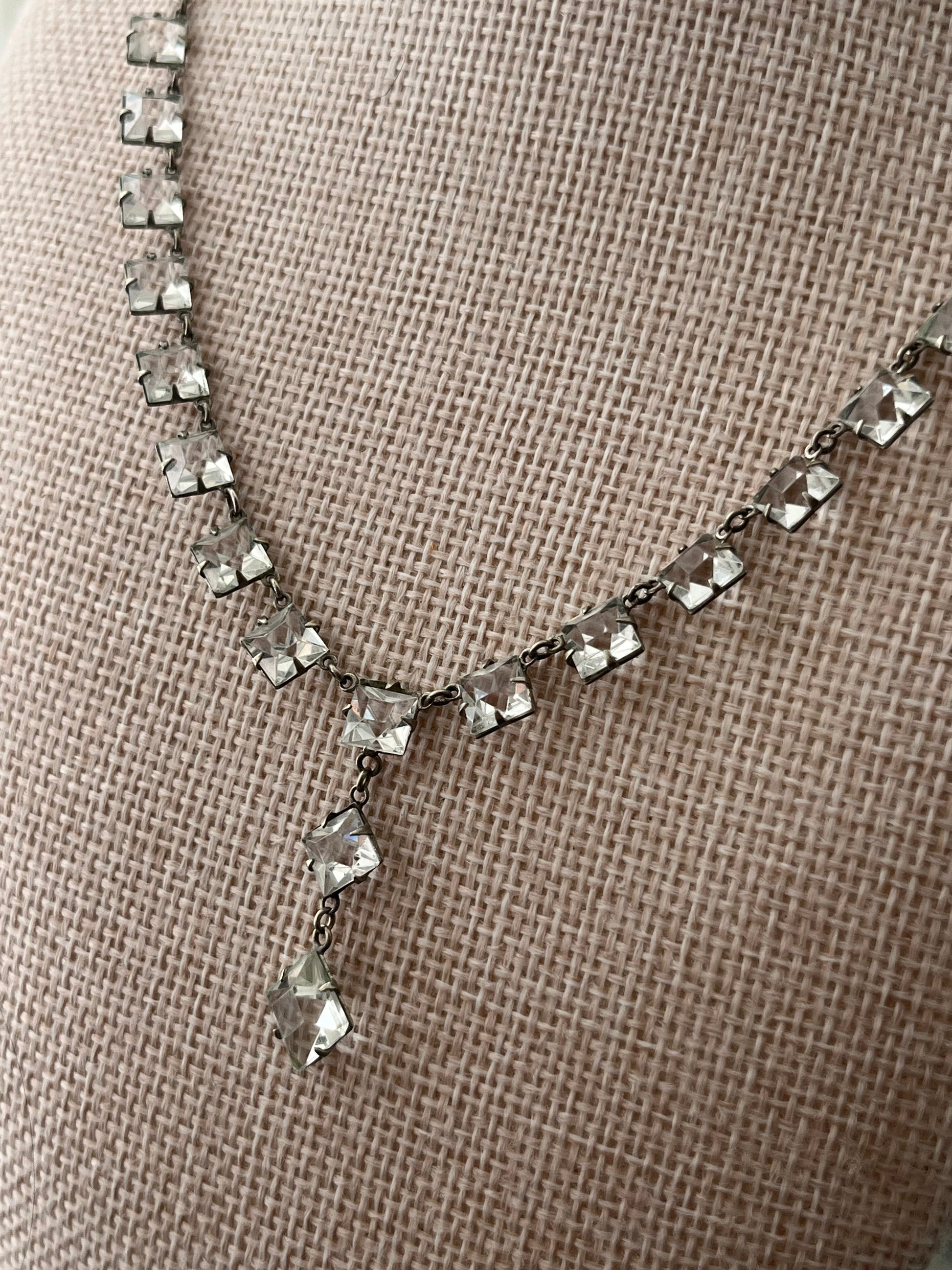 This Art Deco necklace showcases a geometric arrangement of square crystal glass stones, accented by a delicate lariat drop, embodying authentic Gatsby-era elegance.