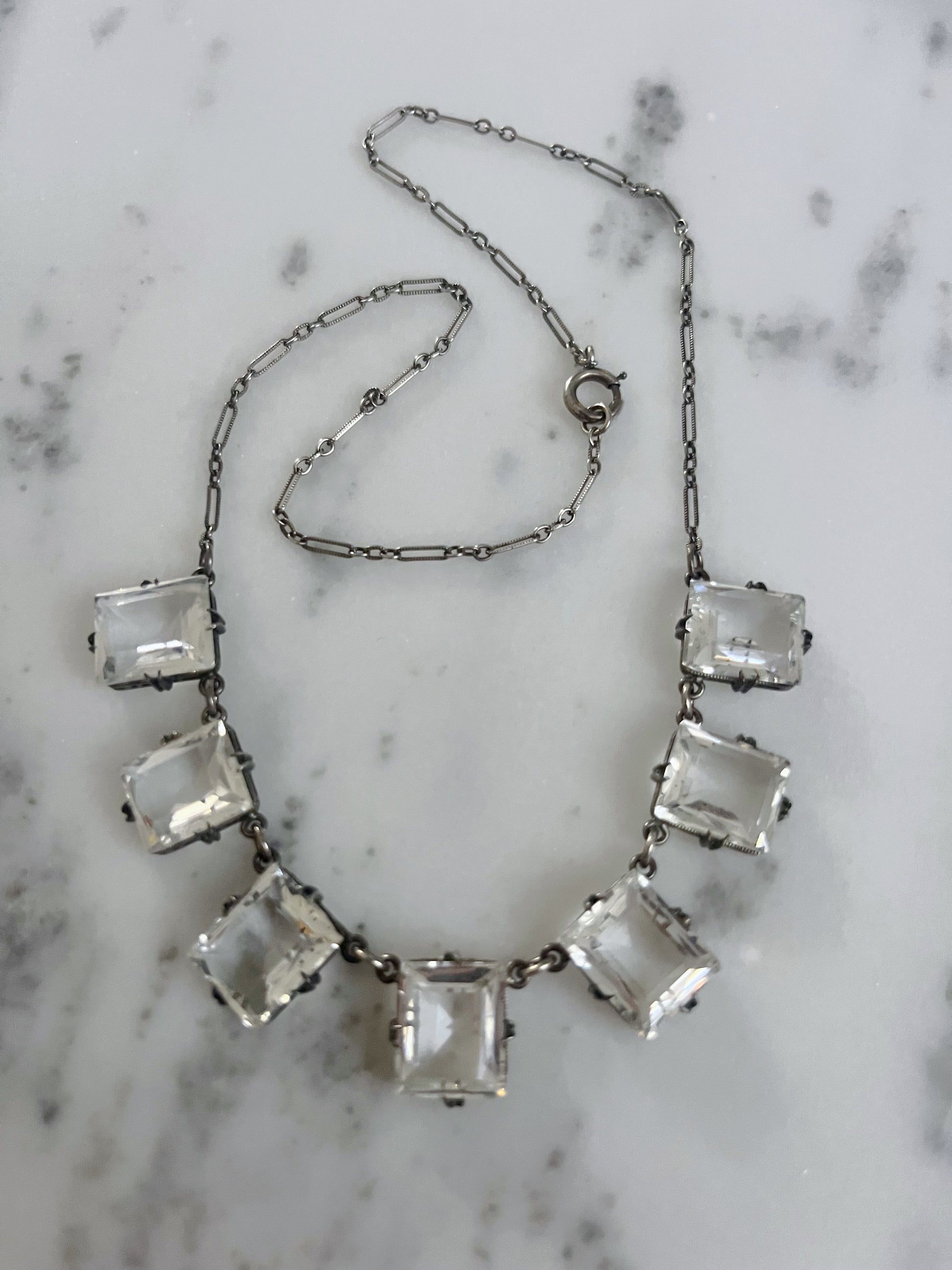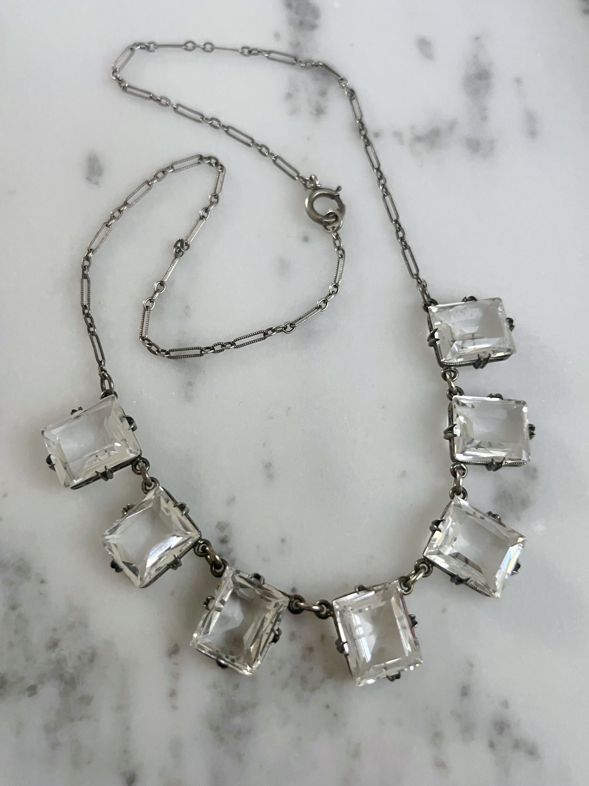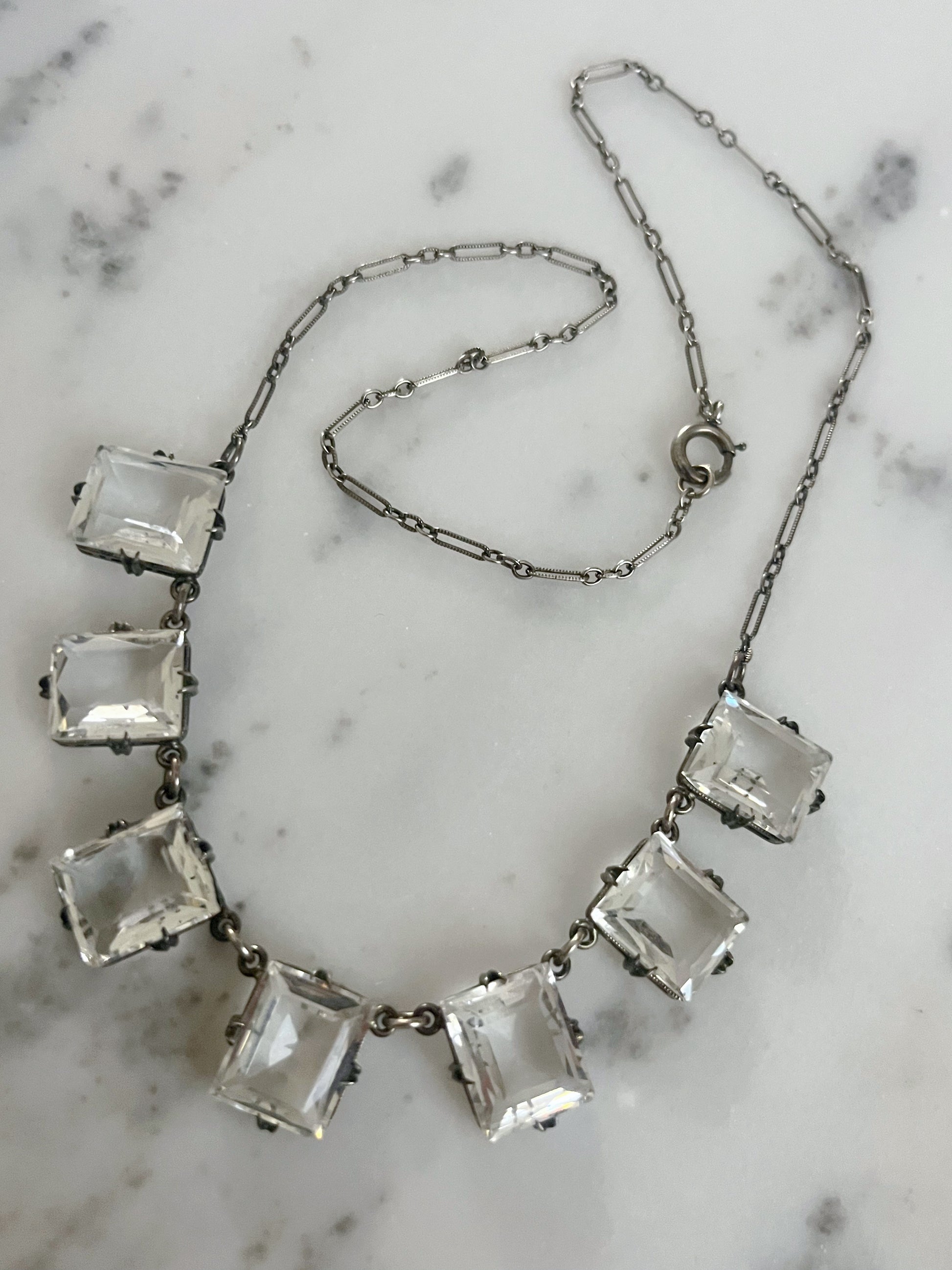 This Art Deco necklace showcases a geometric arrangement of rectangle quartz crystal glass stone on a paperlink like chain, embodying authentic Gatsby-era elegance. Stamped sterling.
