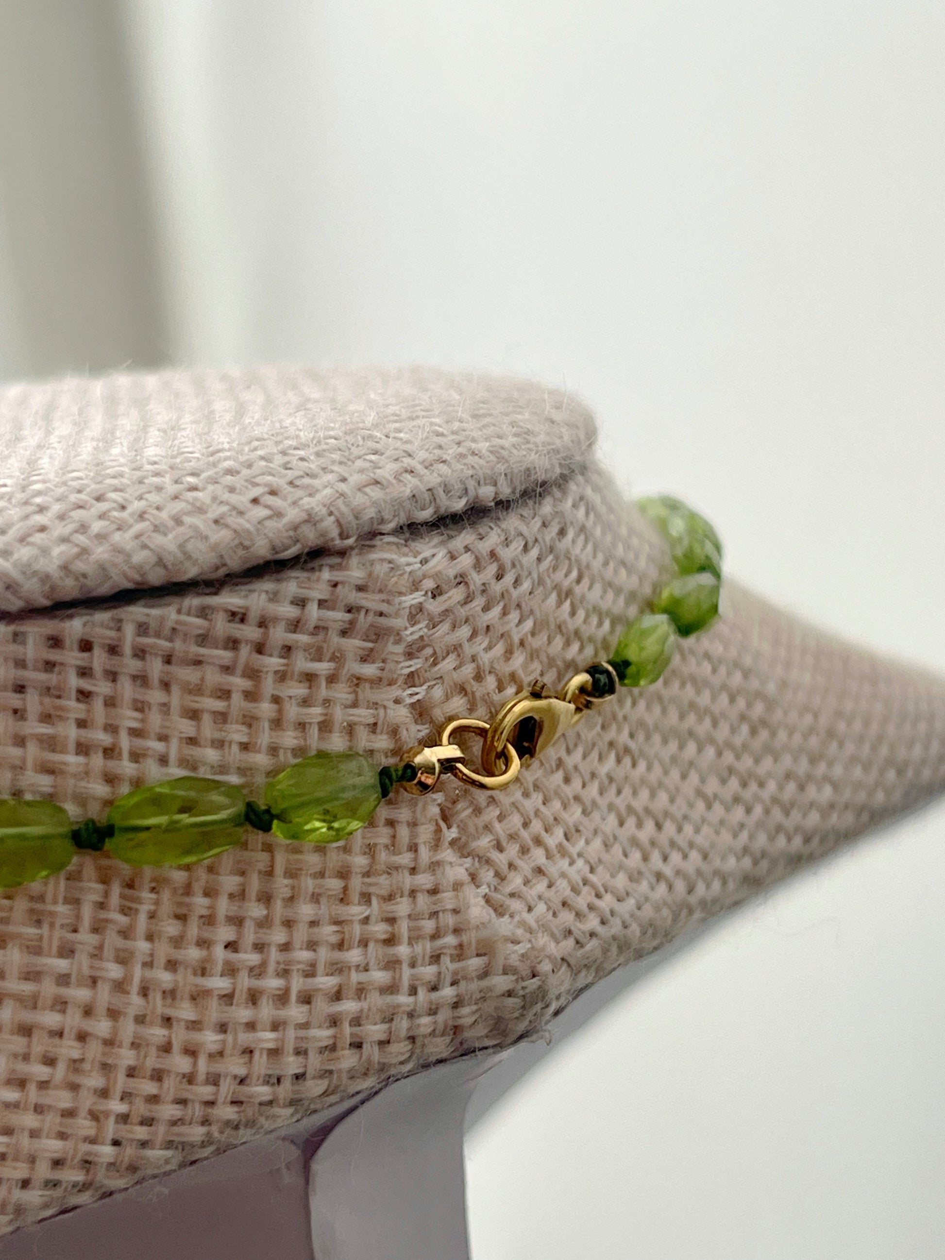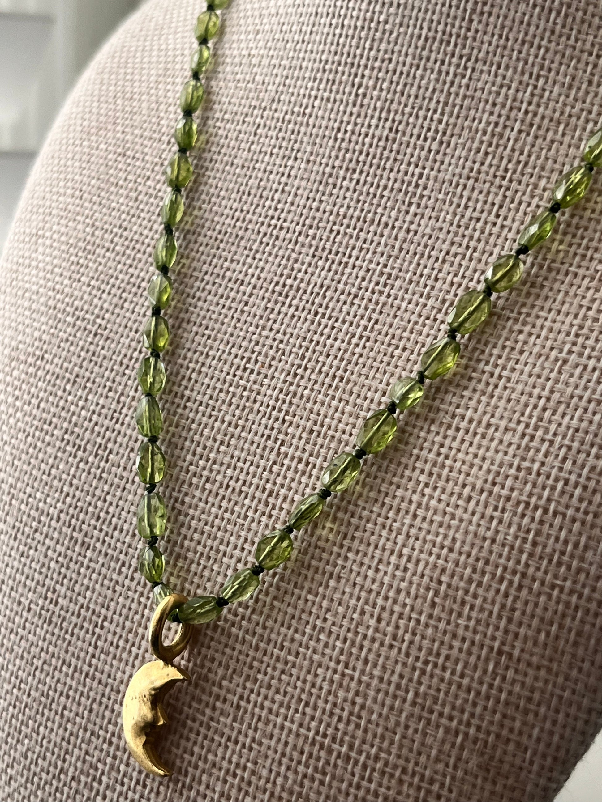 This hand-knotted necklace features lustrous silk and genuine semi-precious peridot gemstones in a vibrant green hue. The hardware clasp is crafted from 14k gold-filled material. The moon man pendant, a mid-century vintage piece.