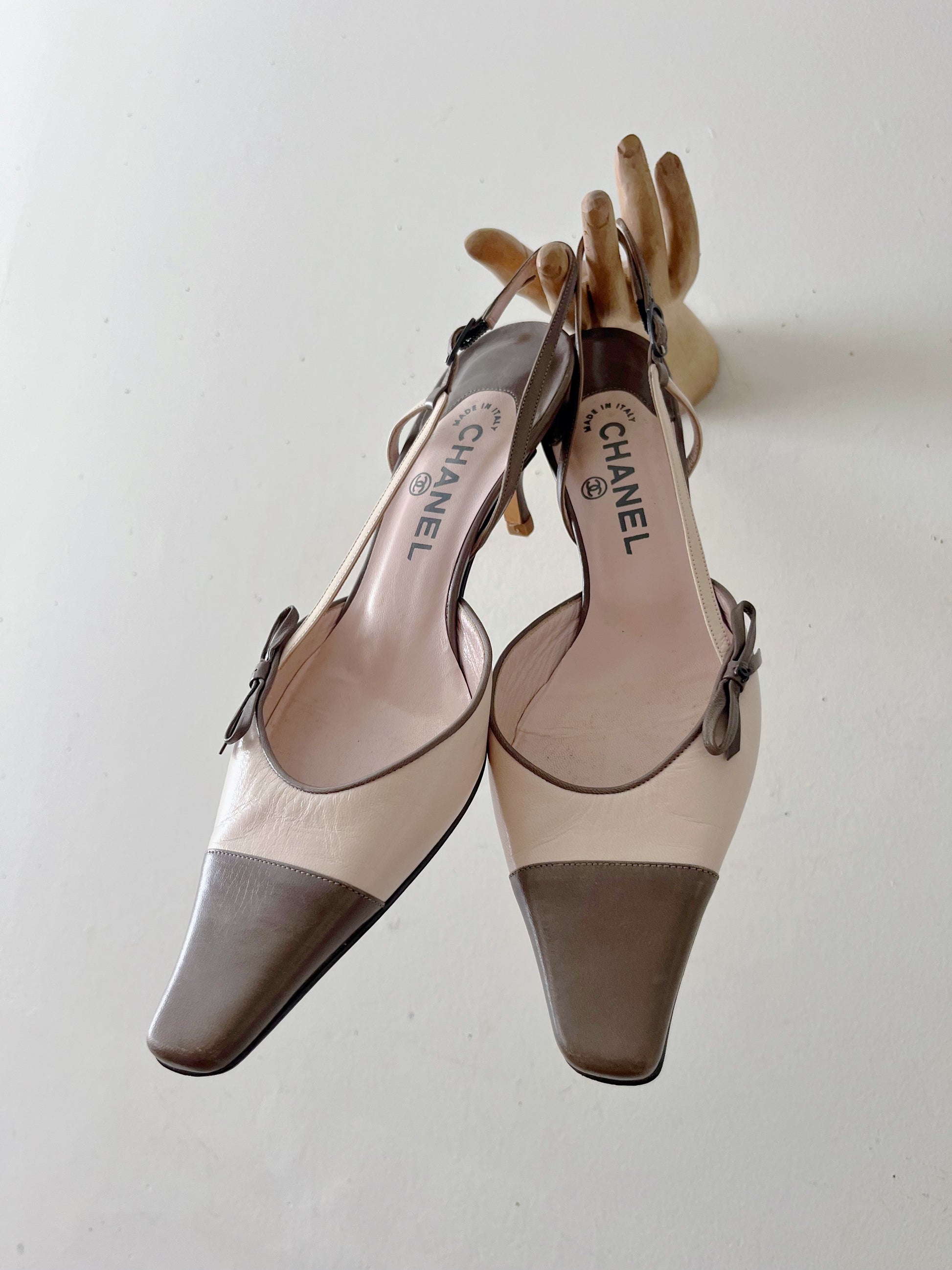 Elevate your style with these classic Chanel kitten heel slingbacks, adorned with an elegant bow detail. Presented in a refined palette of soft warm grey and cream, they offer a graceful and timeless appeal.