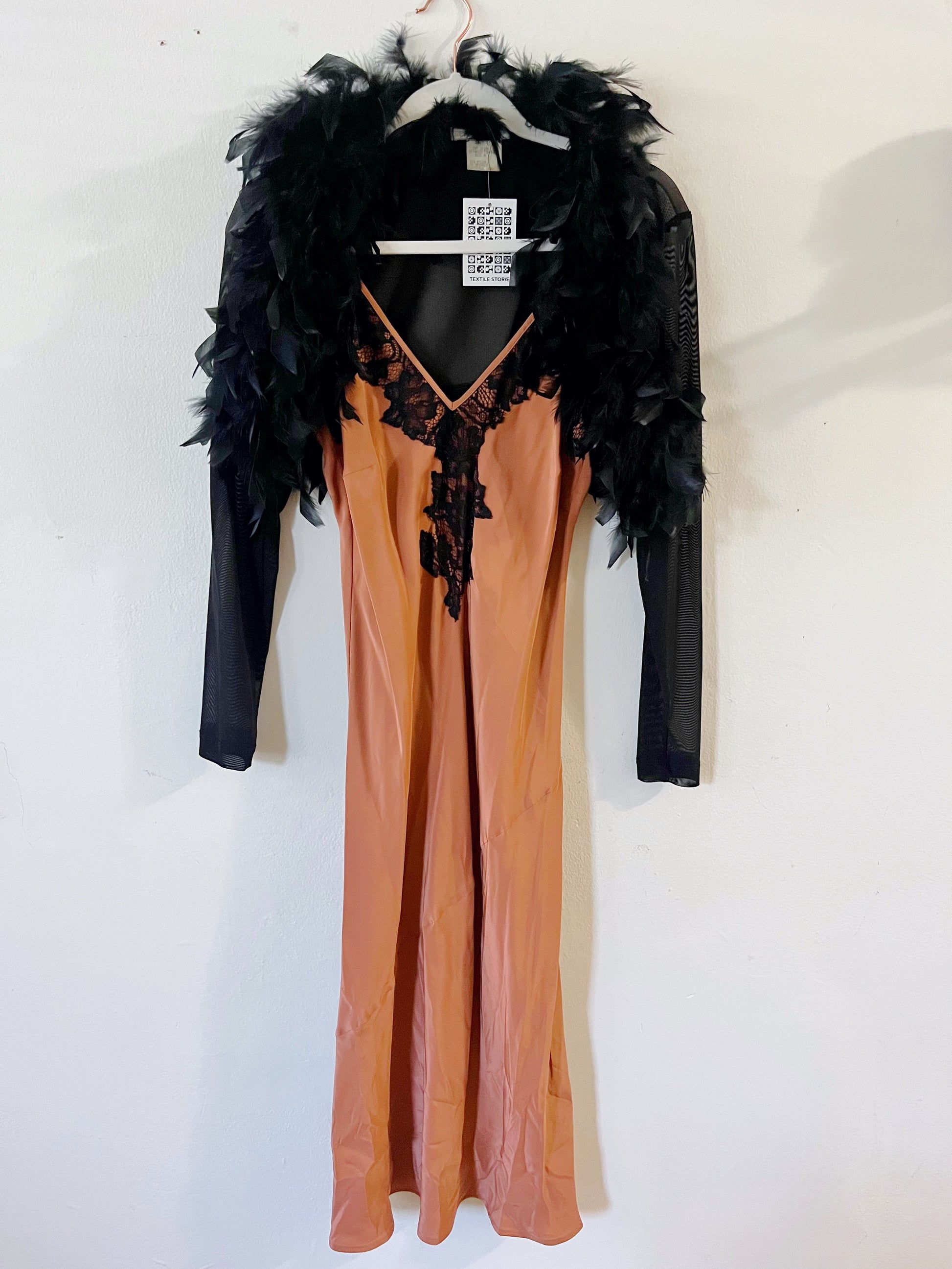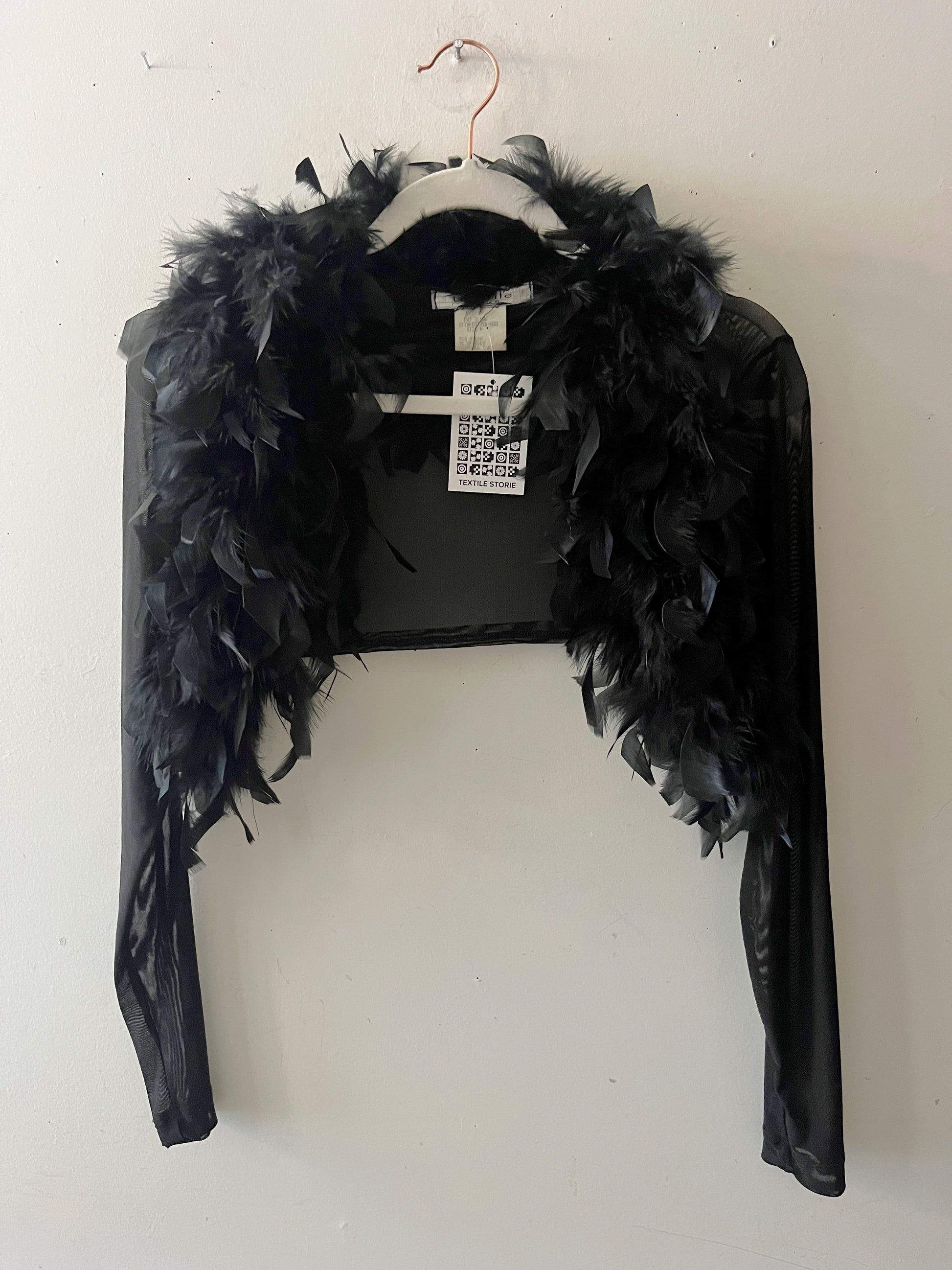 A refined black mesh bolero trimmed with ostrich feathers, designed to add understated drama and bohemian flair to any look. The sheer construction and feathered details create an elegant layering piece perfect for elevating your wardrobe.