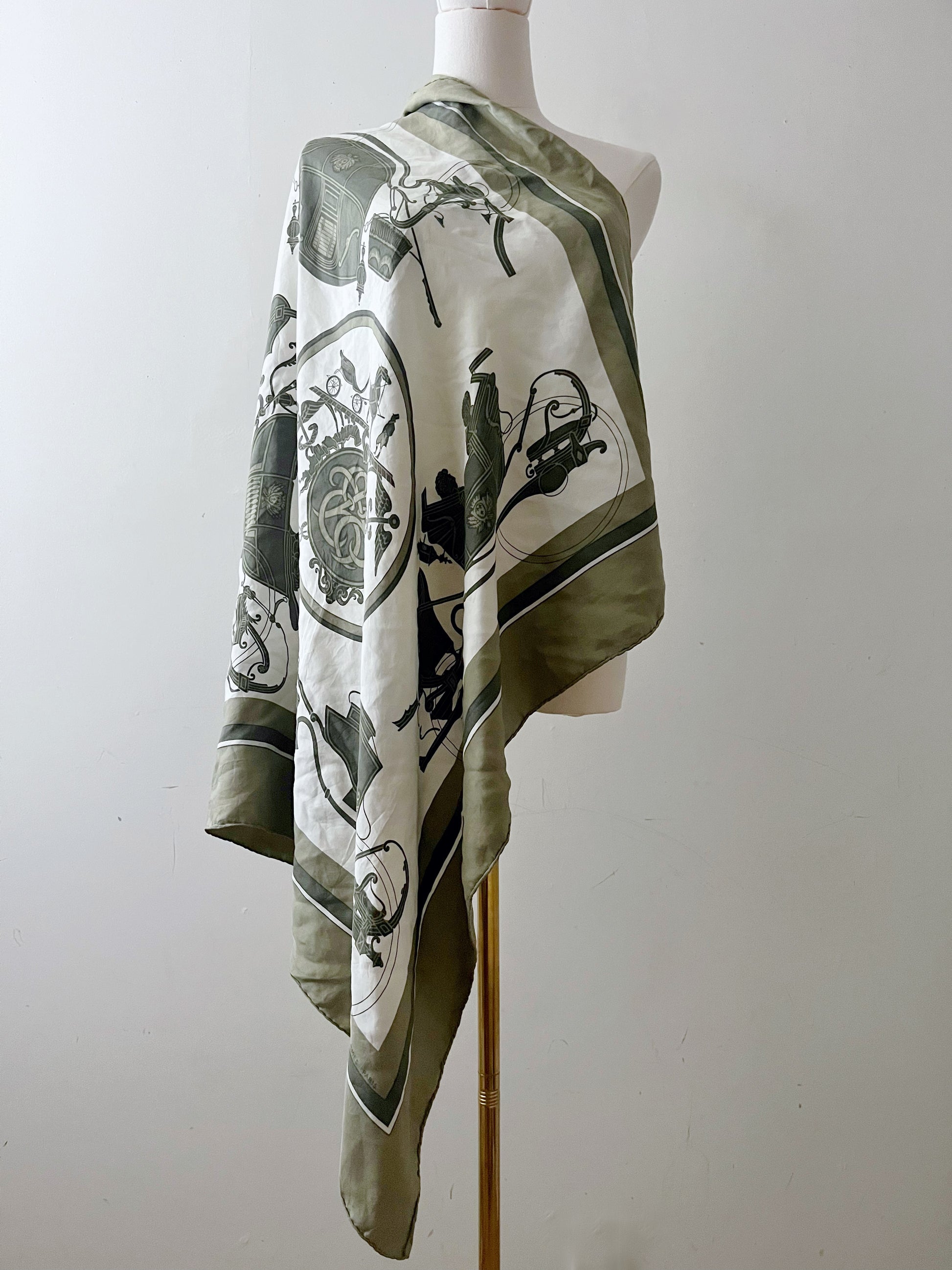 Hermès Ex-Libris Fringed Scarf from the 80s. This iconic design, originally created by Hugo Grygkar in 1946, features a central medallion with a horse-drawn carriage motif, surrounded by four other carriage designs.