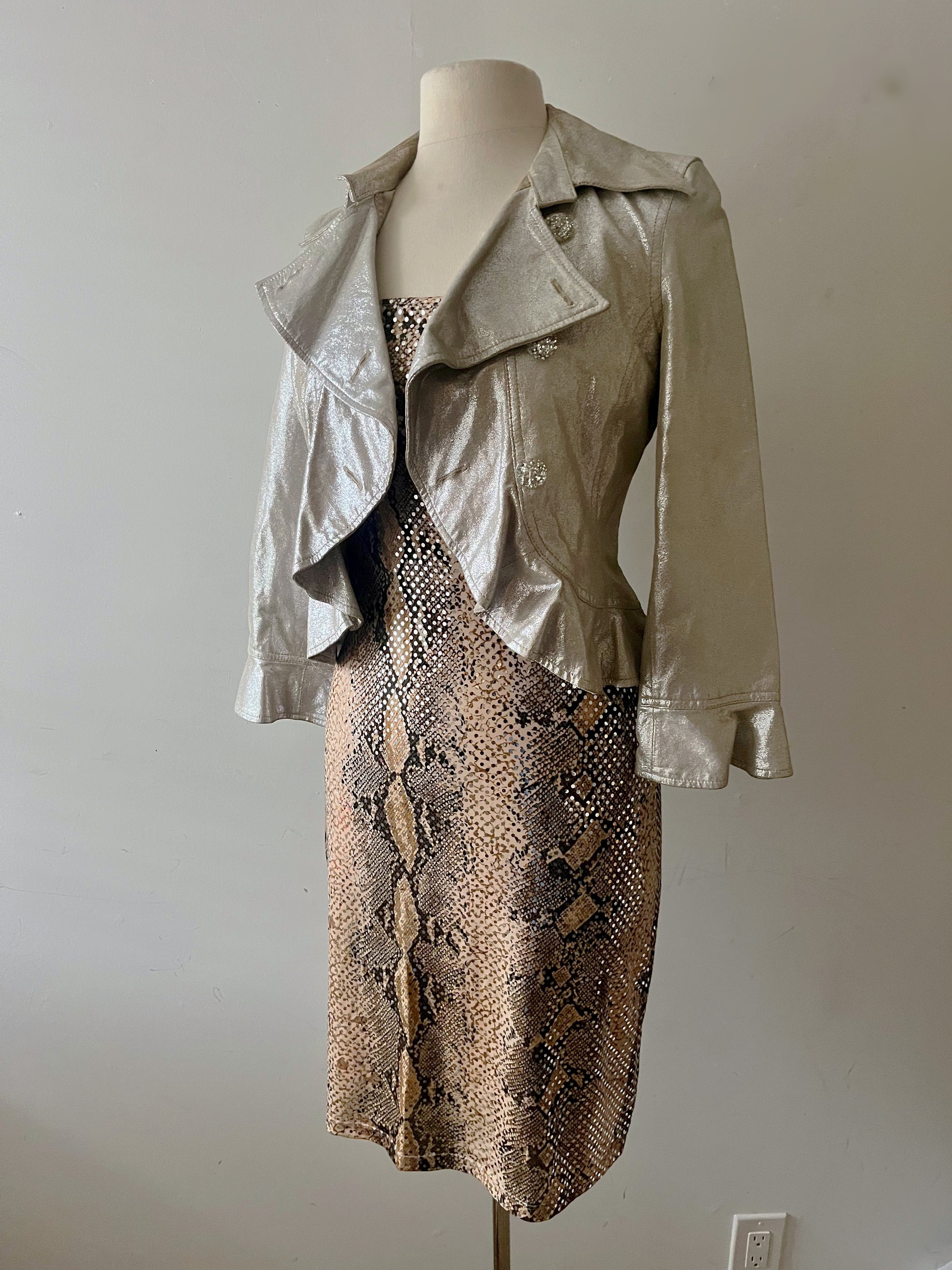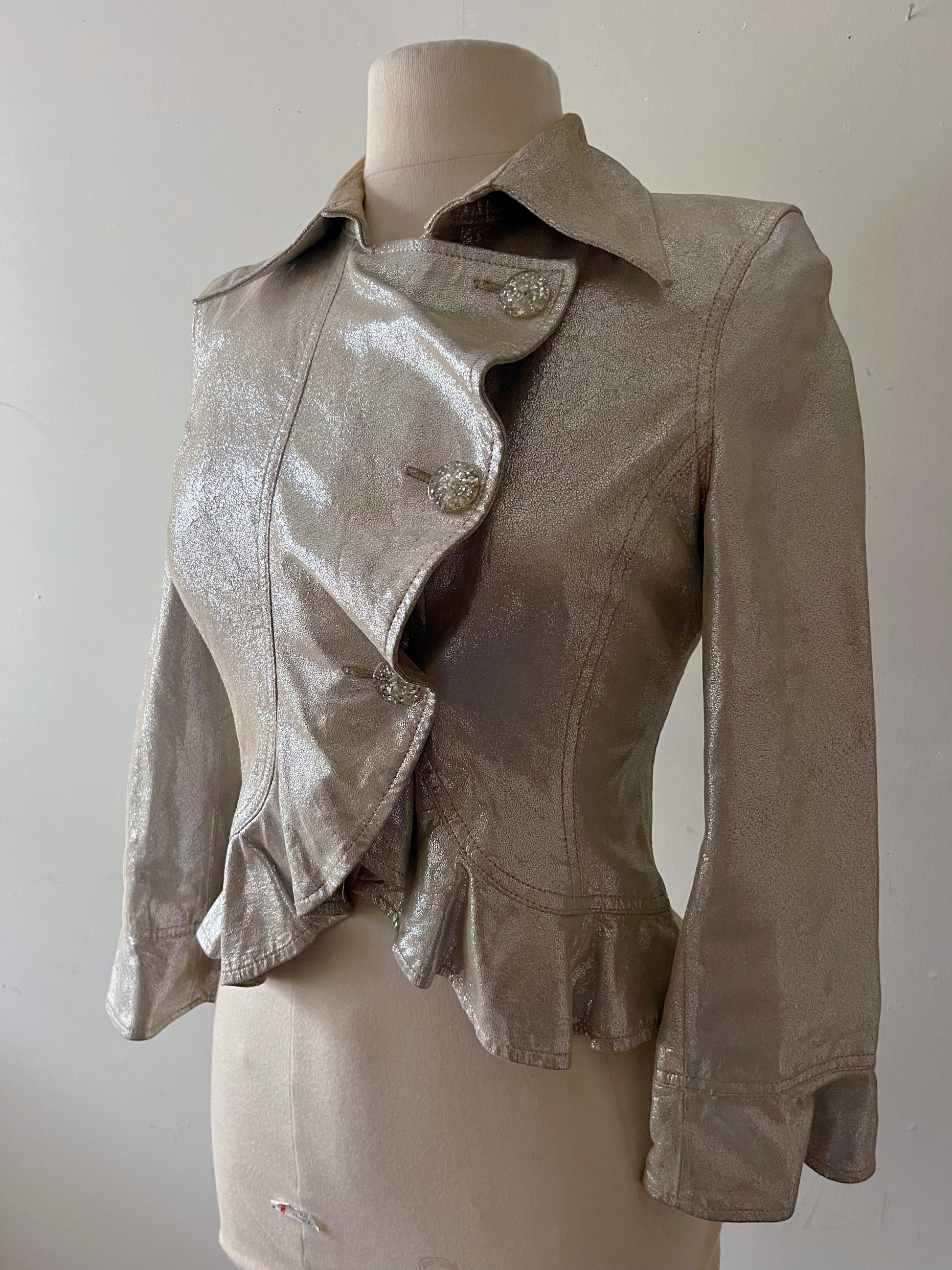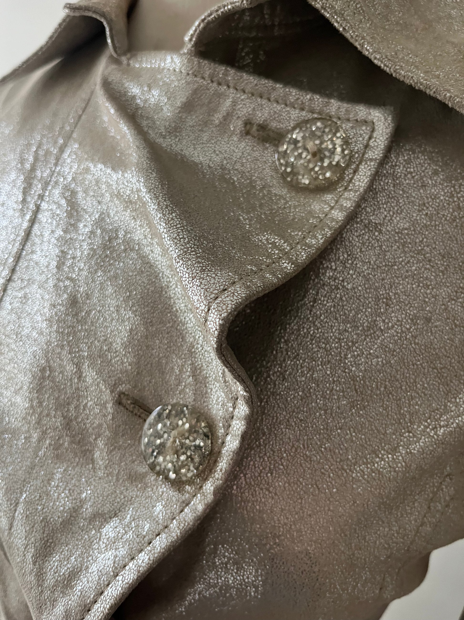 Y2k bebe silver metallic soft leather jacket with a cropped design and lucite glitter buttons with a textural design when buttoned.