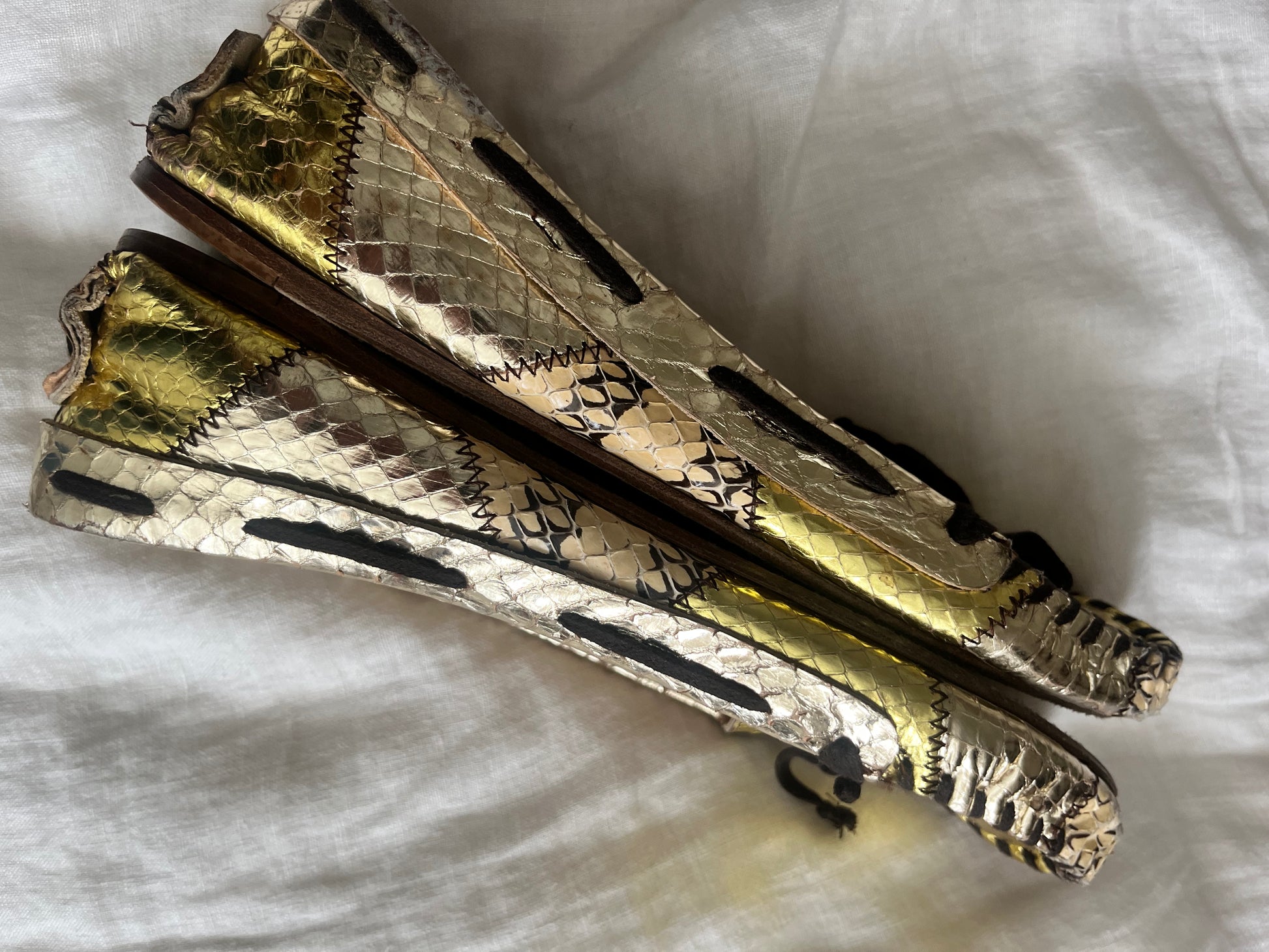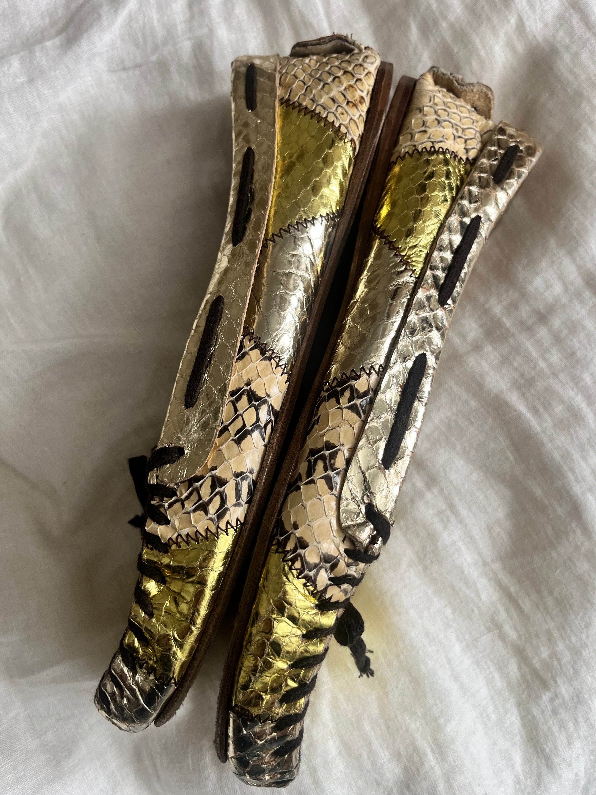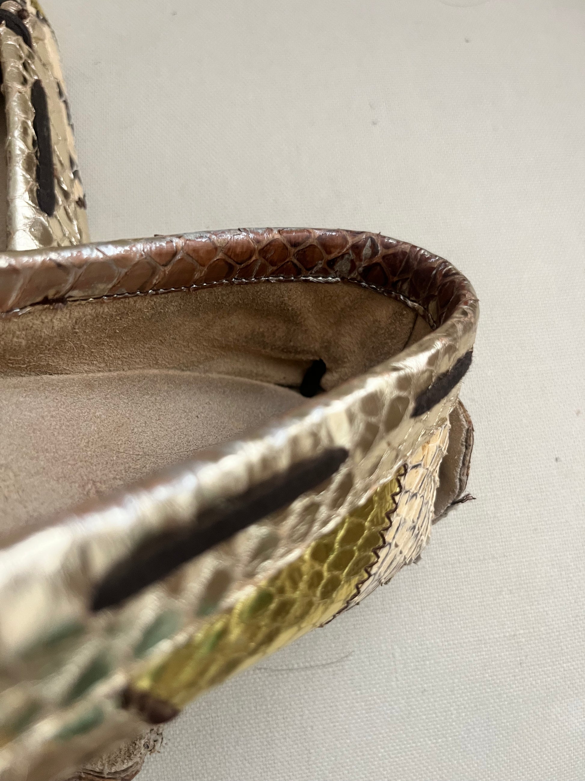 Elevate your style with these vintage MIU MIU moccasin loafers in snake skin with different patchwork of gold and platinum metallics.