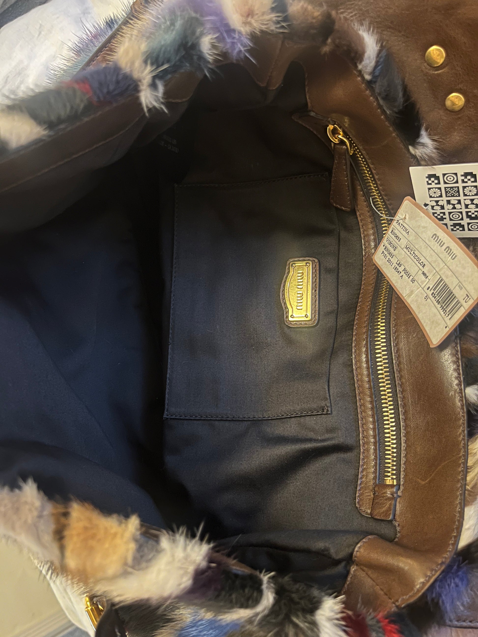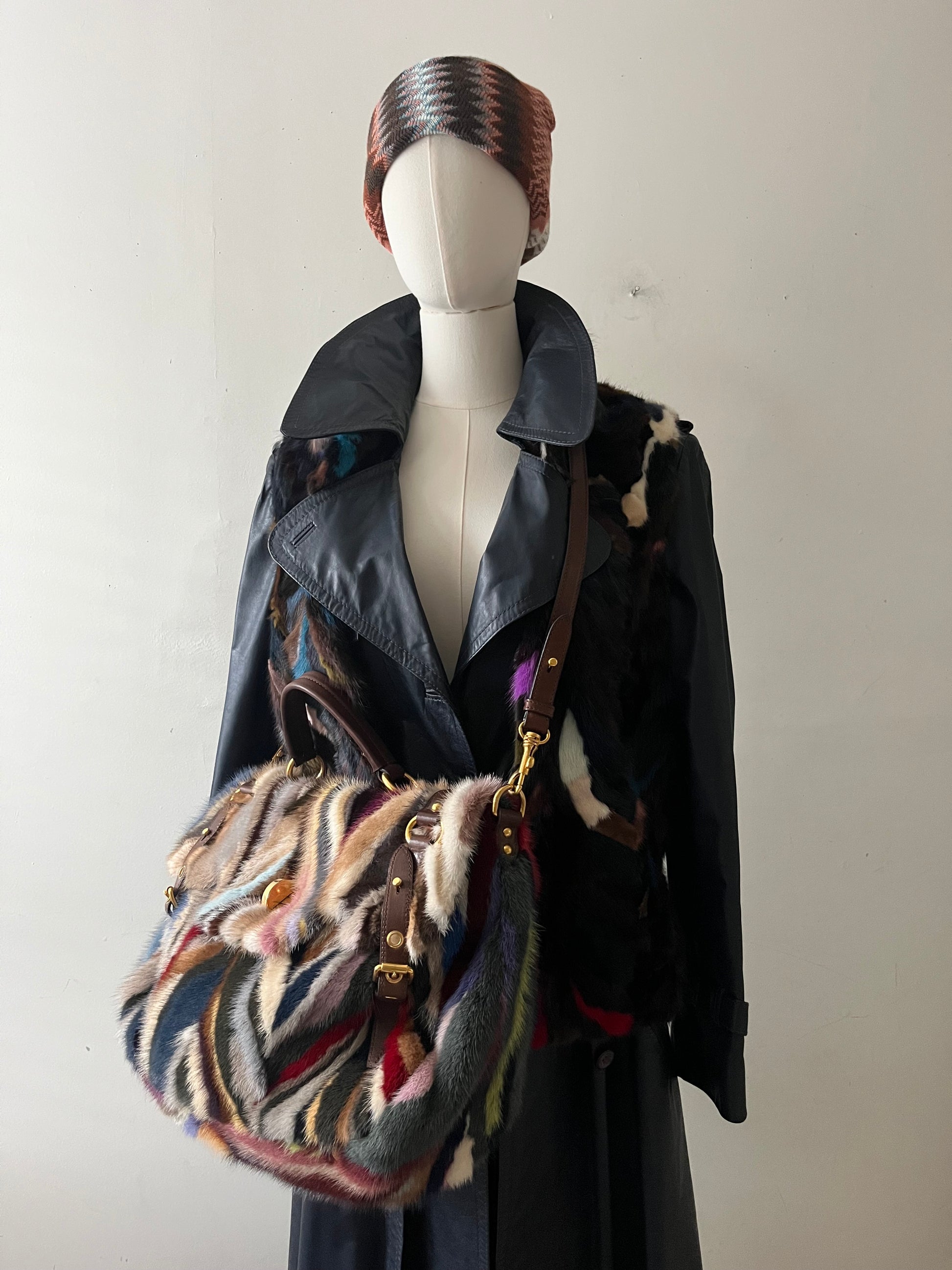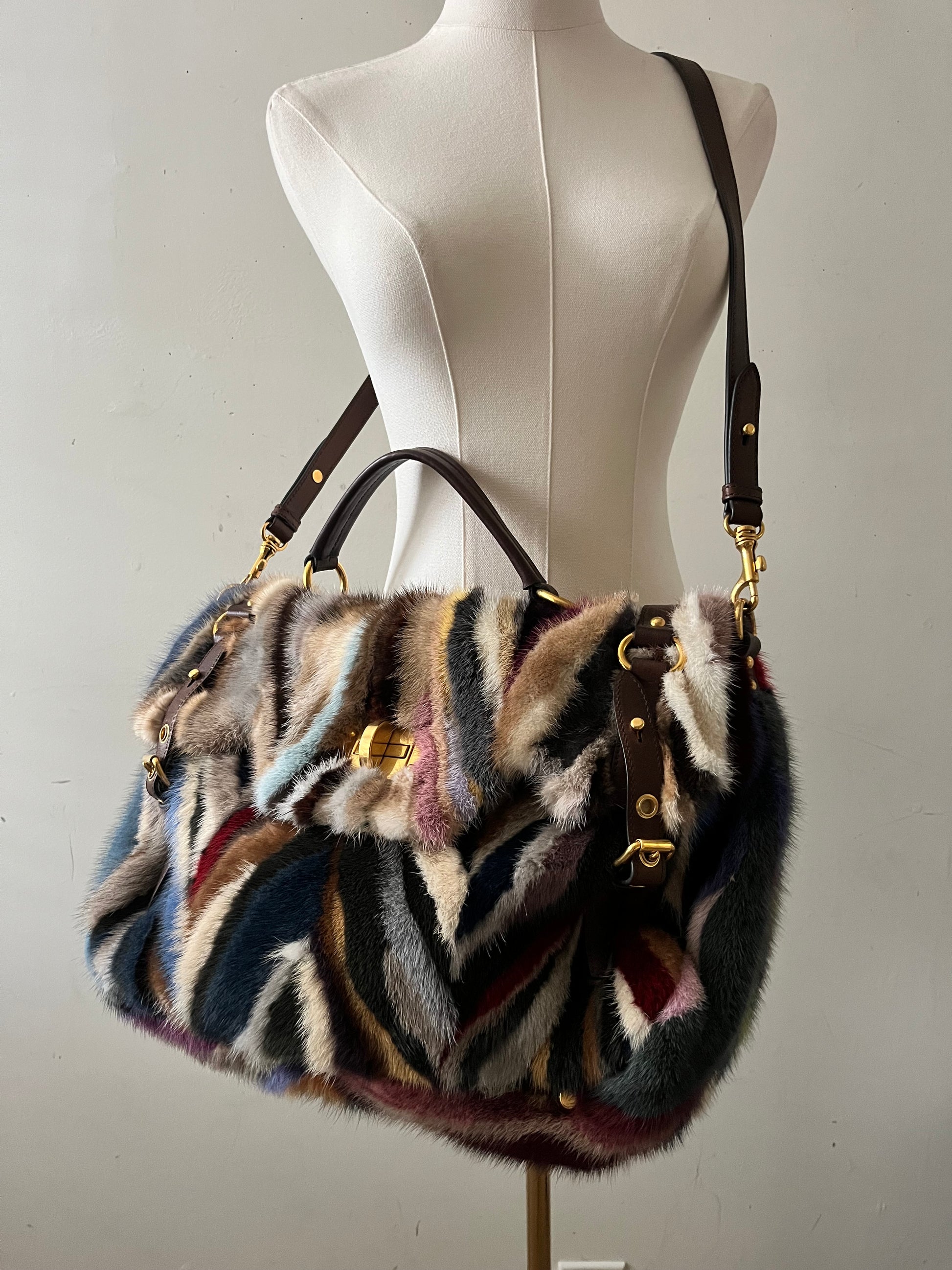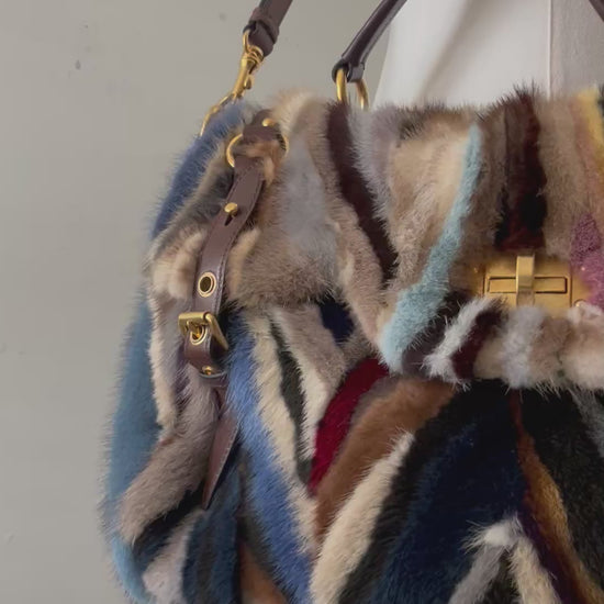 From Fall 2011 this never worn with tags and authentication Y2K Miu Miu minx fur handbag featuring bold, chevron design with a mosaic mix of colors and a signature turn-lock closure. Comes with a detachable crossbody strap. Finished with a stunning deep hunter green interior — a timeless piece with edgy sophistication.