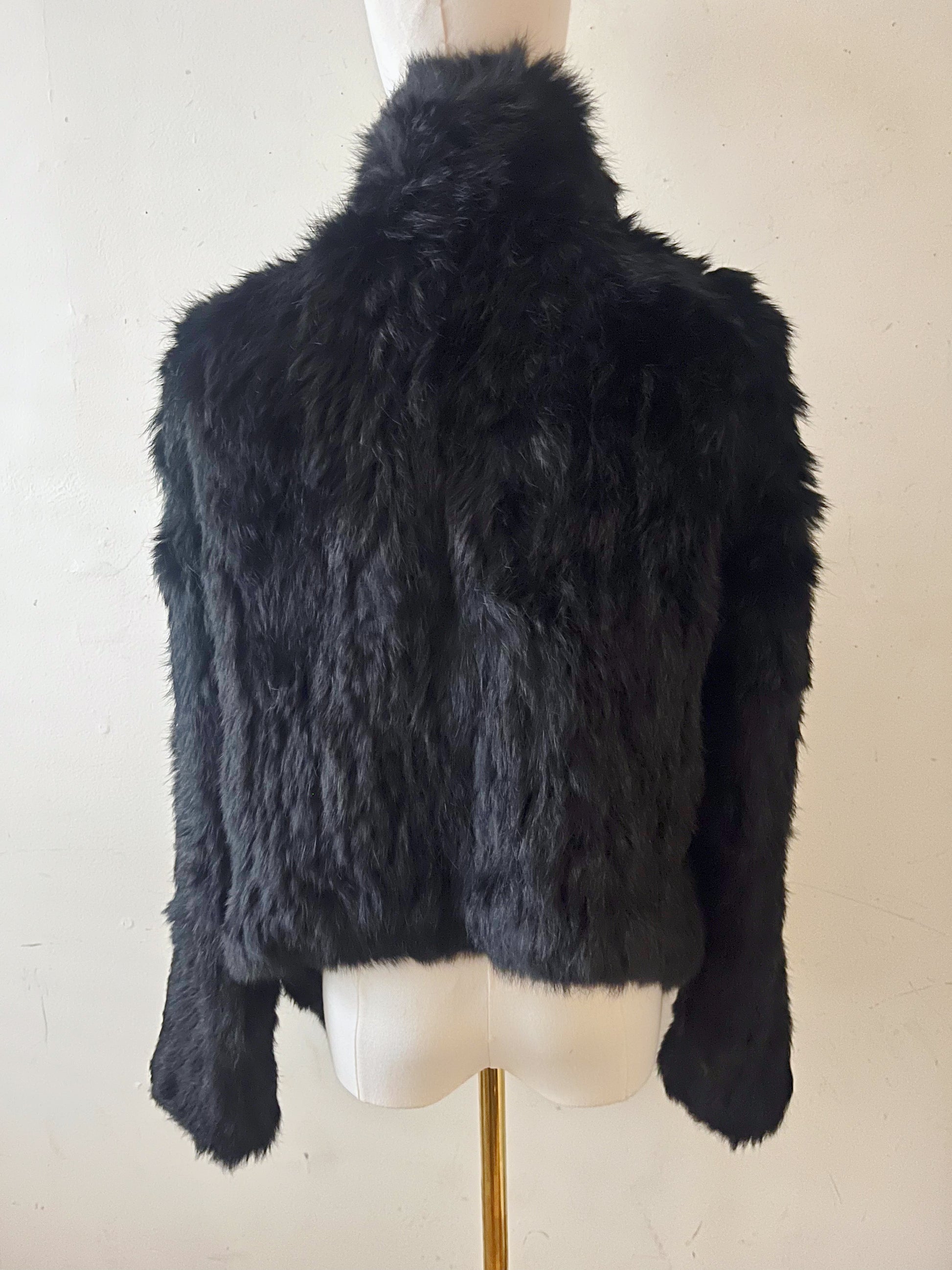 Crafted from luxuriously soft rabbit fur with a distinctive shag finish, this European-inspired open jacket from the early 2000s epitomizes understated elegance. Its versatile silhouette seamlessly complements any wardrobe, while the sumptuous texture invites touch.
