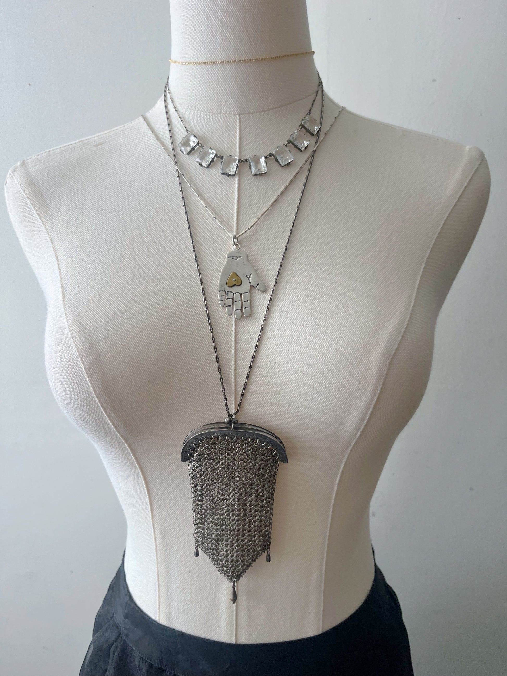 Crafted from antique components, this refined necklace features a sterling silver mesh purse pendant hanging from a stamped long-link sterling silver chain. Blending vintage charm with functionality, the purse contains a small organizer divider, perfect for holding an extra piece of jewelry or chain, making it a distinctive and practical statement piece.